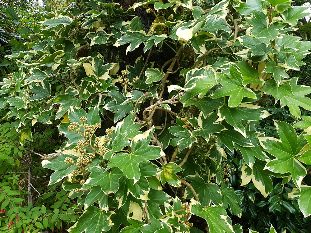 This hybrid between Fatsia japonica and ivy combines large, tropical-style leaves with climbing ability. Its variegated cream-and-green foliage brightens gloomy winter borders and walls. Evergreen thanks to thick, wax-coated leaves, it’s capable of photosynthesising at low light levels thanks to shade-adapted chloroplasts, which remain active even on short winter days.