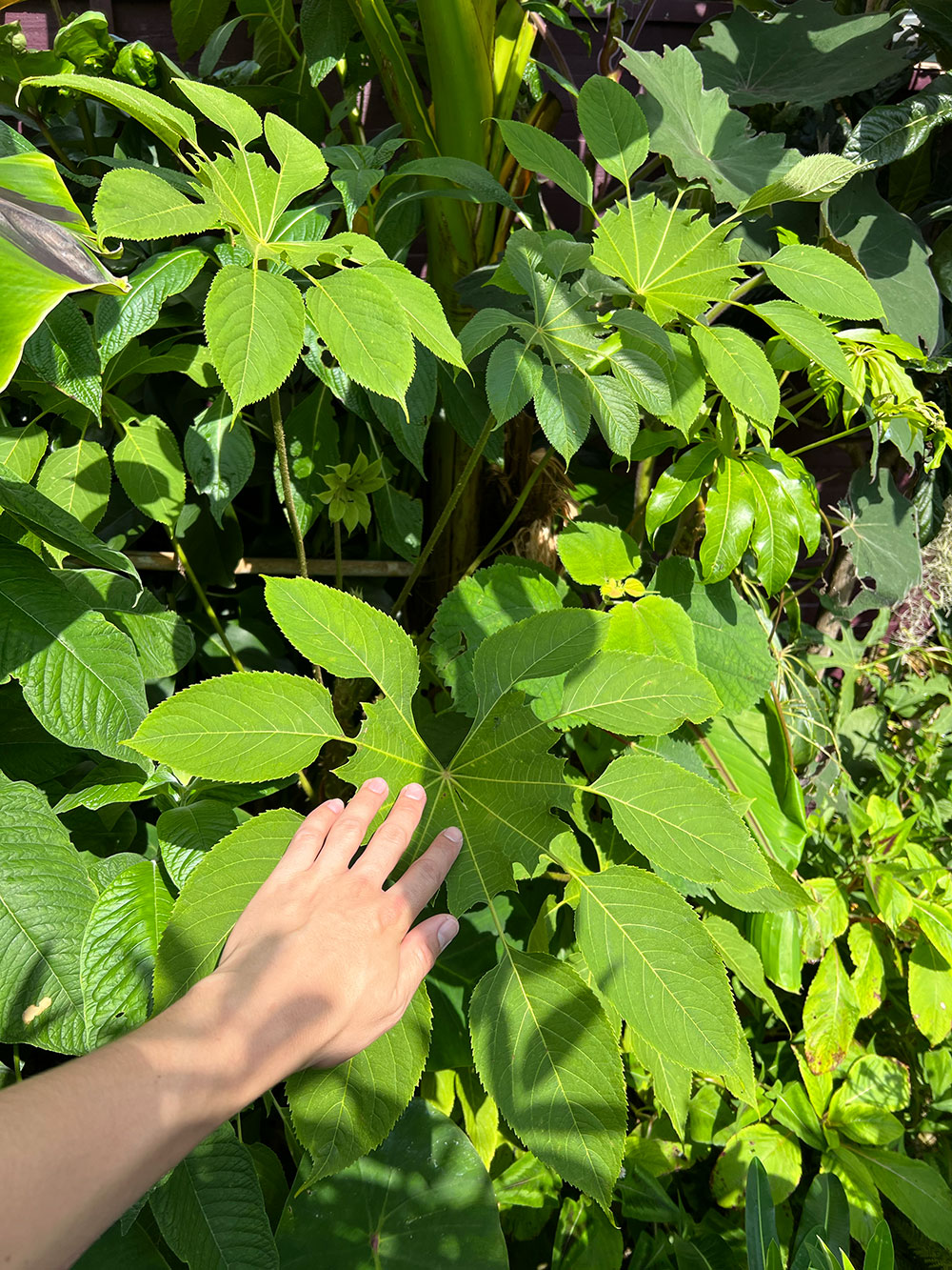 Brassaiopsis mitis is a small, deciduous to semi-evergreen tree or shrub native to the Himalayas. It is highly valued for its striking, large, deeply-lobed, snowflake-shaped leaves, giving it a tropical, architectural look. The plant has a spiny trunk and stems. It is borderline hardy, preferring sheltered positions in partial shade.