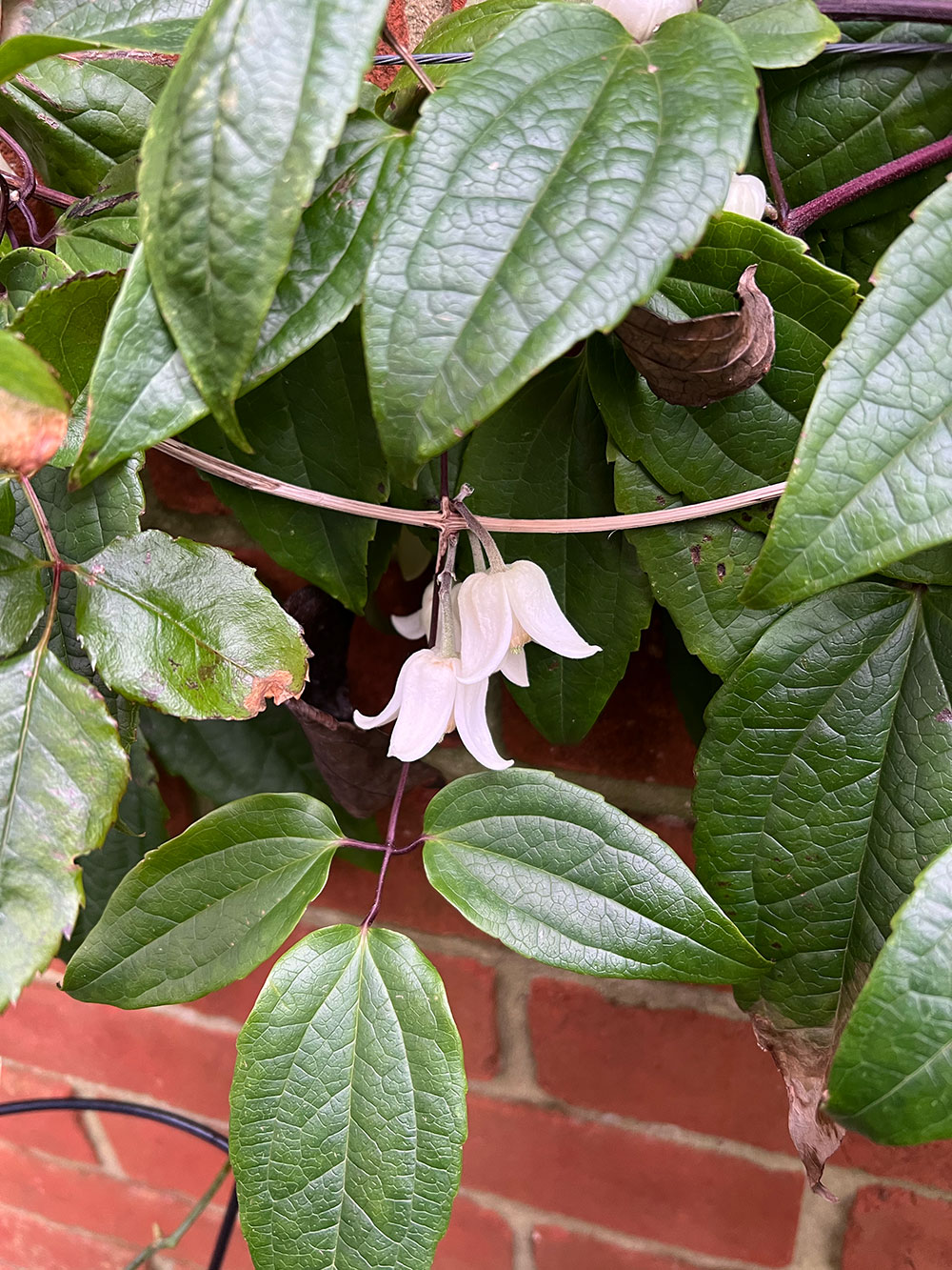 Clematis urophylla ‘Winter Beauty’ prefers consistently moist but well-drained soil. Regular watering during its main growing period (spring to early autumn) supports strong root establishment and healthy evergreen foliage. Mulching helps retain moisture and keeps the root zone cool. In winter, water sparingly—excess moisture in cold periods can lead to root stress. Once mature, it tolerates short dry spells, though prolonged drought can reduce future flowering.
