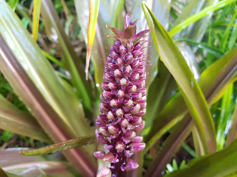 Eucomis ‘Sparkling Burgundy’ is a striking pineapple lily cultivar known for its bold, dark burgundy foliage that deepens with strong sunlight. In summer, it produces upright stems topped with dense spires of starry purple flowers crowned with leafy bracts, giving the plant its pineapple-like look. It originates from South African Eucomis species found in grasslands and rocky slopes. In gardens, it is valued for its dramatic colour shift from spring through summer and its ability to provide exotic flair in borders or containers.
