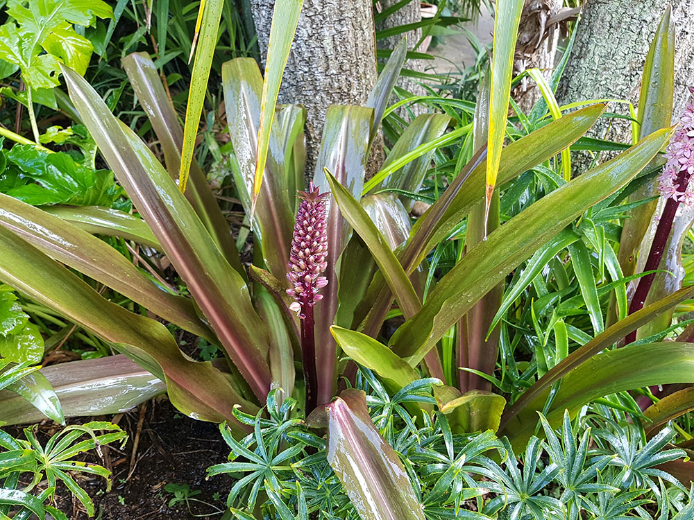 Eucomis ‘Sparkling Burgundy’ typically grows between 45 and 75 cm (18–30 in) tall when in full bloom, with the flower spike contributing most of the height. The foliage alone tends to stay around 30–45 cm. Its upright yet compact structure makes it suitable for both foreground and mid-border use. Height can vary depending on soil richness, watering, and sunlight intensity—plants grown in strong sun with adequate moisture tend to produce sturdier stems and deeper leaf colouration.