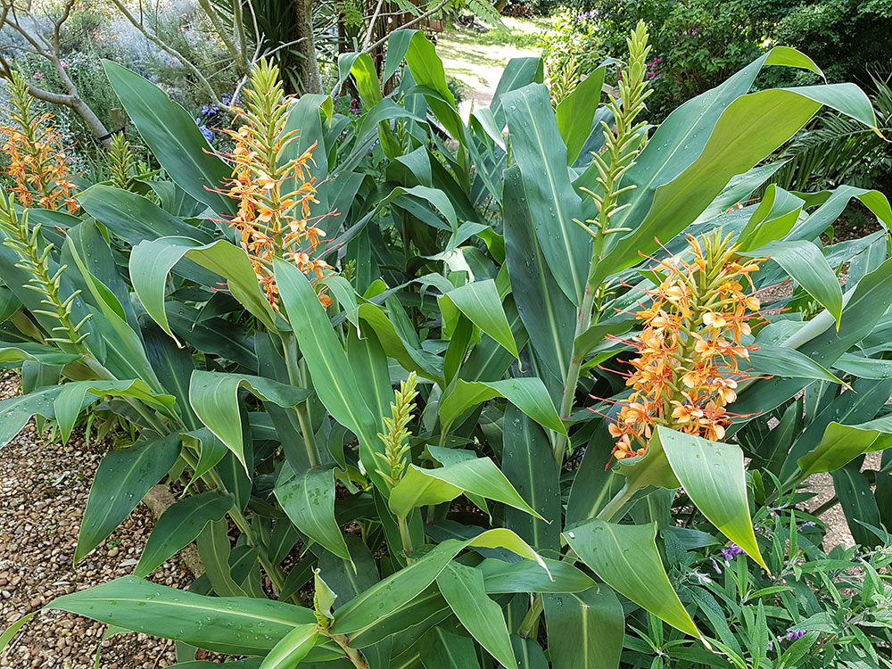 Hedychium ‘Tara’ typically grows to around 150–200 cm (5–6.5 ft) in good conditions. The height comes from tall, cane-like stems that rise from the rhizomes, each clad in broad, glossy, lance-shaped leaves. Flower spikes add extra visual height late in the season. The plant’s vertical habit makes it excellent for adding height and drama without occupying large horizontal space, perfect for narrow borders or areas where strong vertical structure is needed.