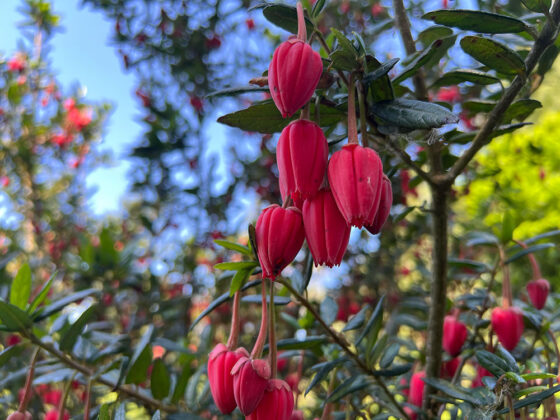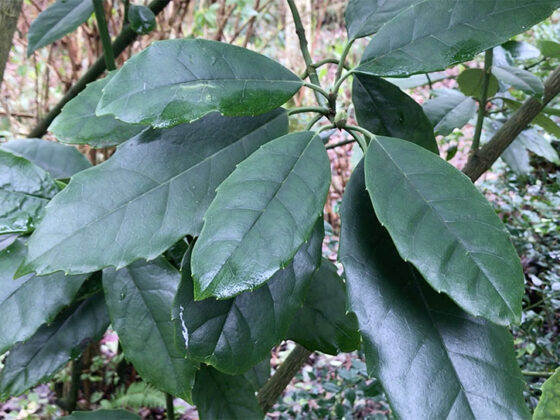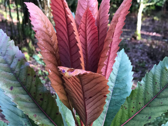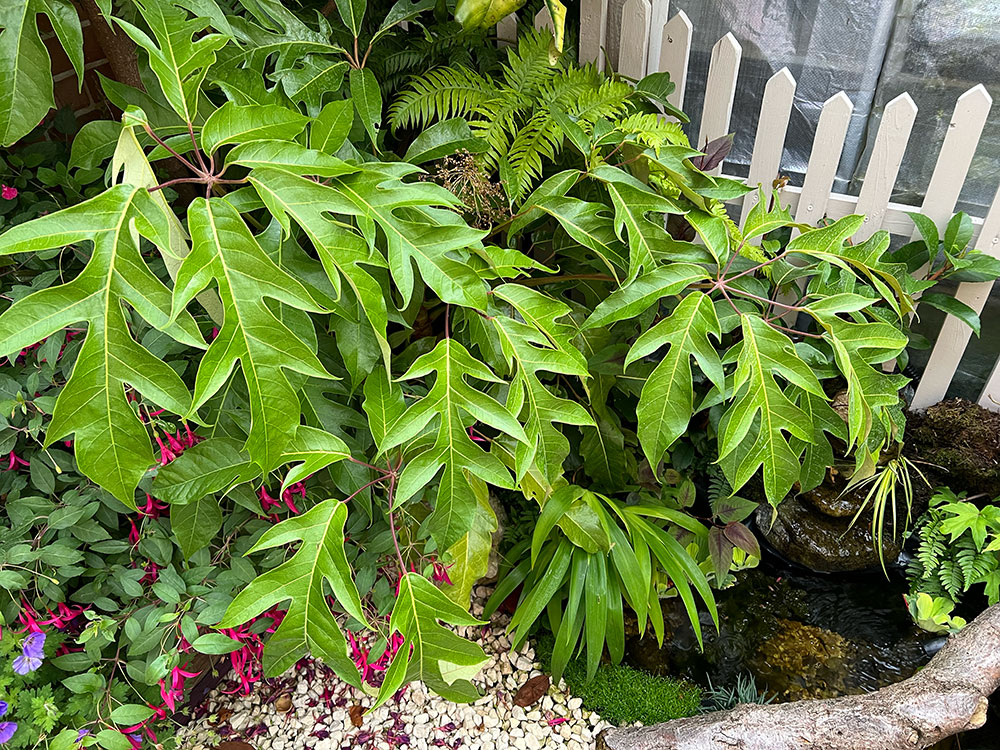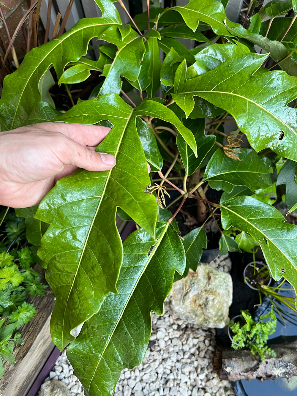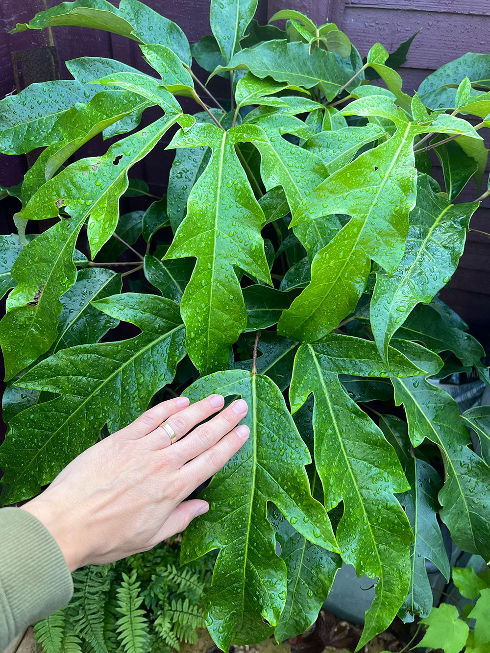 Heptapleurum delavayi (formerly Schefflera delavayi) is native to the montane forests of southwest China. It forms a bold, architectural evergreen with large, leathery, palmate leaves that give a distinctly subtropical look. In maturity, plants may produce dramatic, branched flower panicles in late summer, followed by ornamental seed heads. Its natural habitat of cool, high-altitude forests explains its surprising cold tolerance compared with many tropical-looking shrubs. There are varying forms available such as the ‘Oak Leaf’ form pictured.
