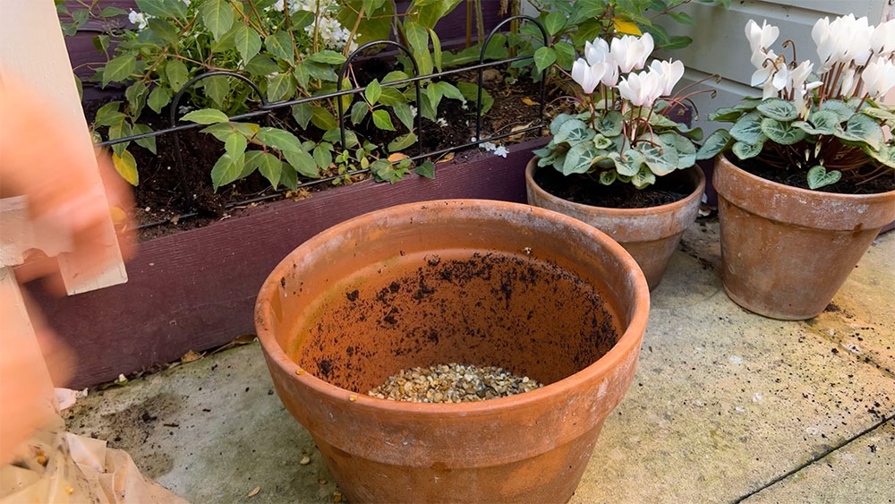 - Add a drainage layer: Place a layer of grit or gravel in the bottom to improve drainage and stop holes from clogging. This also adds weight, which helps prevent pots from toppling over in strong winds.