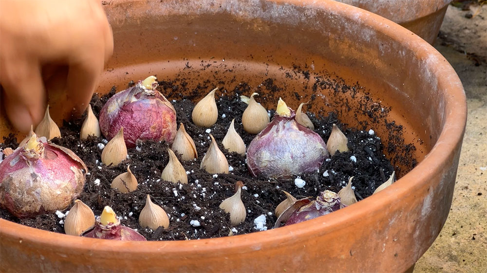The first step is to choose a pot that’s both wide and deep enough for your bulbs. As a general rule, bulbs should be planted at a depth of around two to three times their own height.
